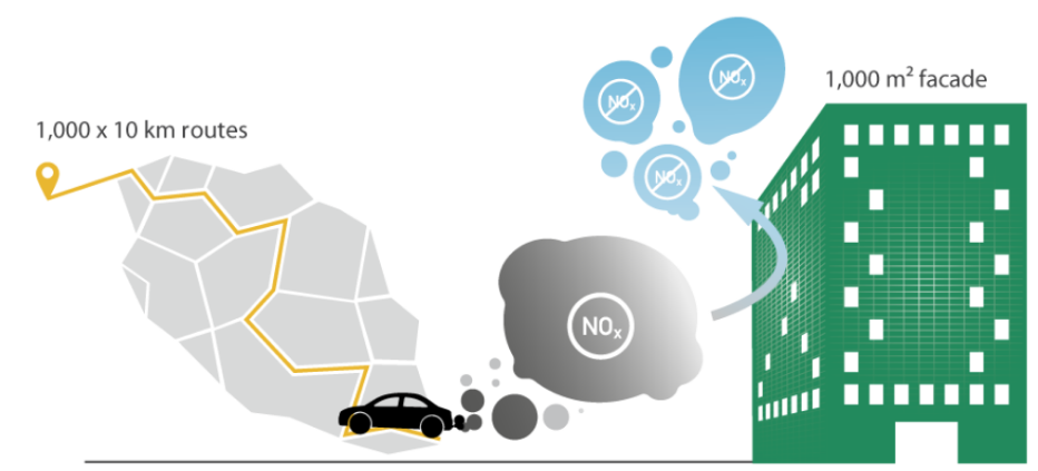 1000 m2 de fachada HYTECT neutralizan al año las emisiones de NOx equivalentes a 1000 trayectos de 10km en auto.