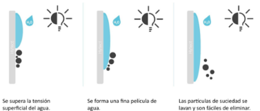 La superficie cerámica es hidrófila, por lo tanto, las gotas de lluvia en lugar de comportarse normalmente, es decir, de repartirse en perlitas, se reparten formando una película finísima que arrastra la suciedad.